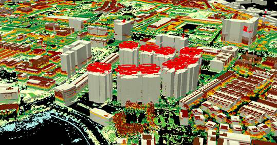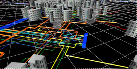 *在具有準(zhǔn)確尺寸的三維模型基礎(chǔ),可以進(jìn)行區(qū)域性專業(yè)分析,如城市交通噪音分析、城市熱島效應(yīng)分析等。下圖所示為城市風(fēng)場三維分析示意效果。
